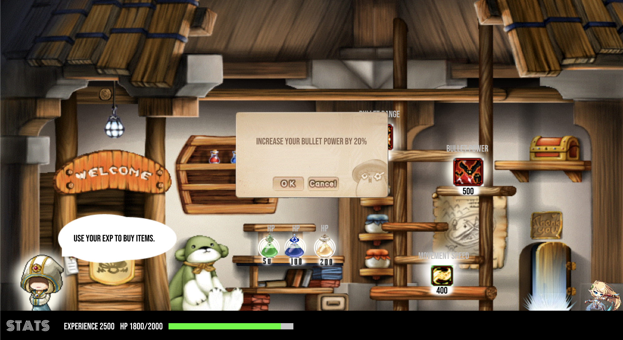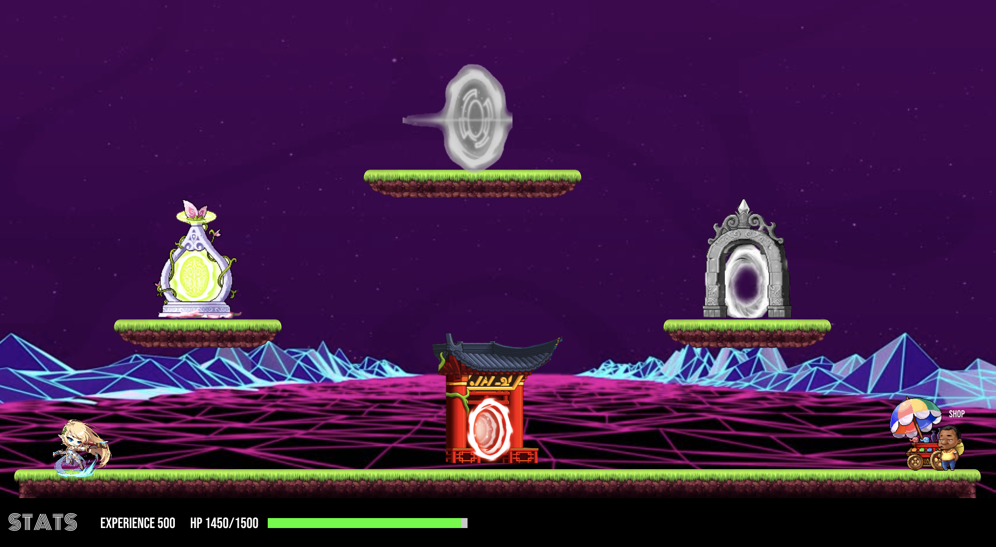 The map features multiple portals to different worlds and a shop. Each portal gets unlocked as soon as the previous level is completed. Once you have finished a level, you can go back to play again to gain more experience points.