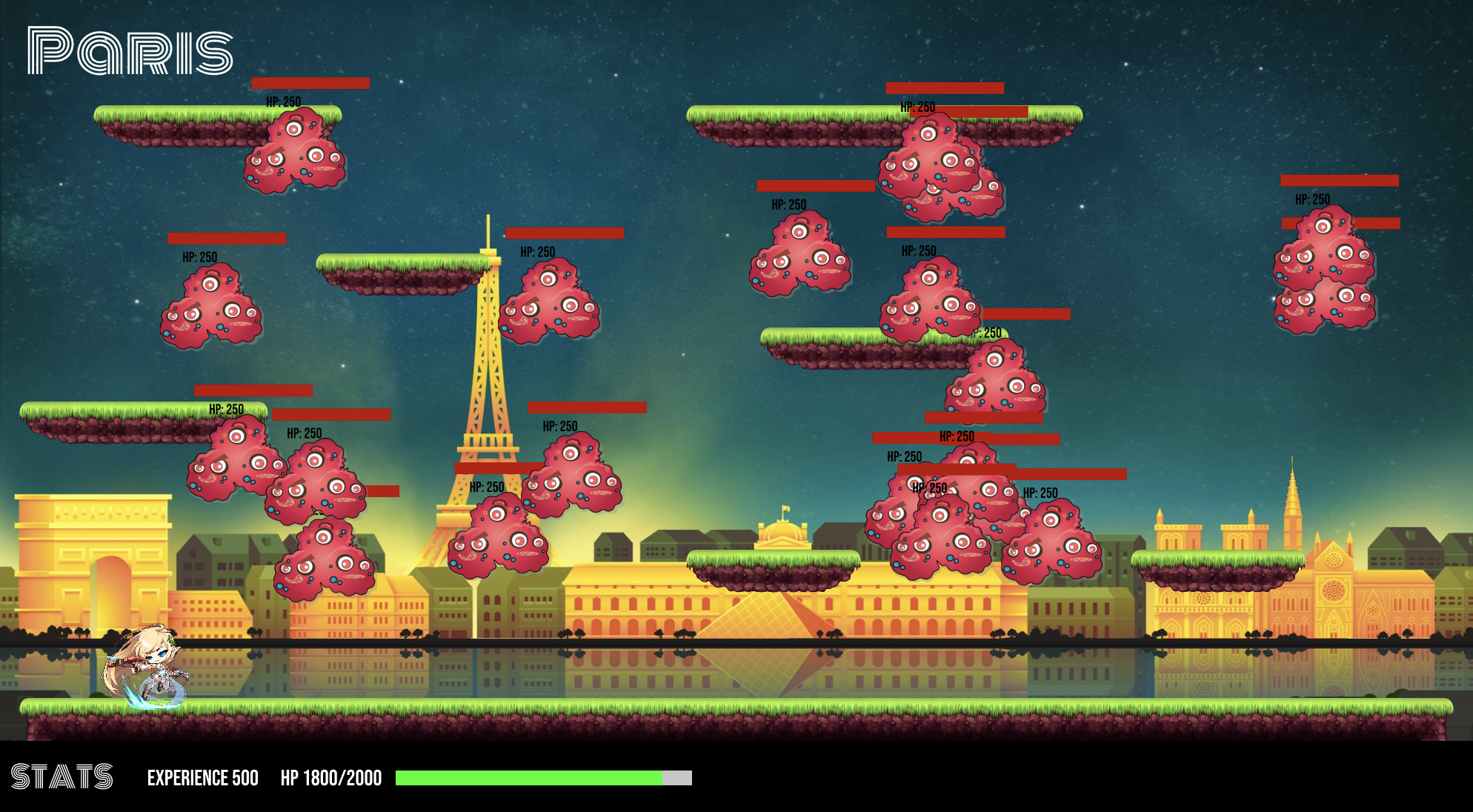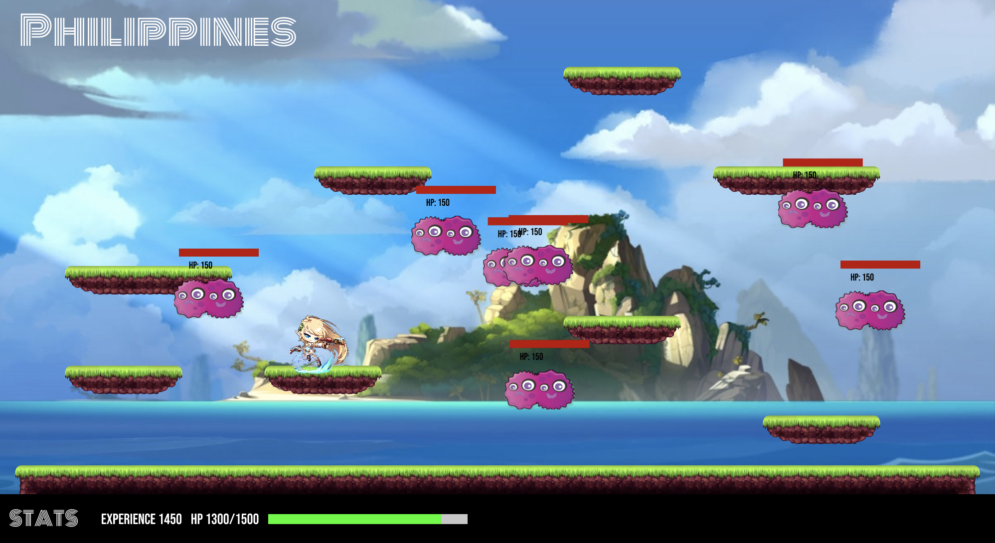 Each covid particle stores its own health points and has a location that is randomly generated. They move on the X-axis based on Perlin Noise, but don't move vertically. If the player comes into contact with a covid particle, they will lose health points. To kill the covid particles, the player can shoot bullets from a magic gun using the 'X' key. Once a covid particle's health points reach 0, they die, and the player gains experience points. Once all the covid particles have been killed, a portal opens up on the right side of the page, which the user can use to go back to the map. If the player's health points drop below 0, then they lose the game.